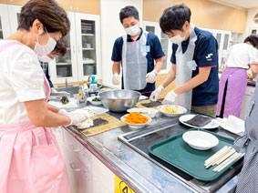 料理交流会では、調理道具、具材の下ごしらえなど全て青年部で準備してくださいました。青年部と女性会の混合グループの調理テーブルで、海苔の上にご飯と具材を置いて仕上げ、お互いのキンパを褒め合いながら和やかに試食しました。たいへんおいしくいただきました。